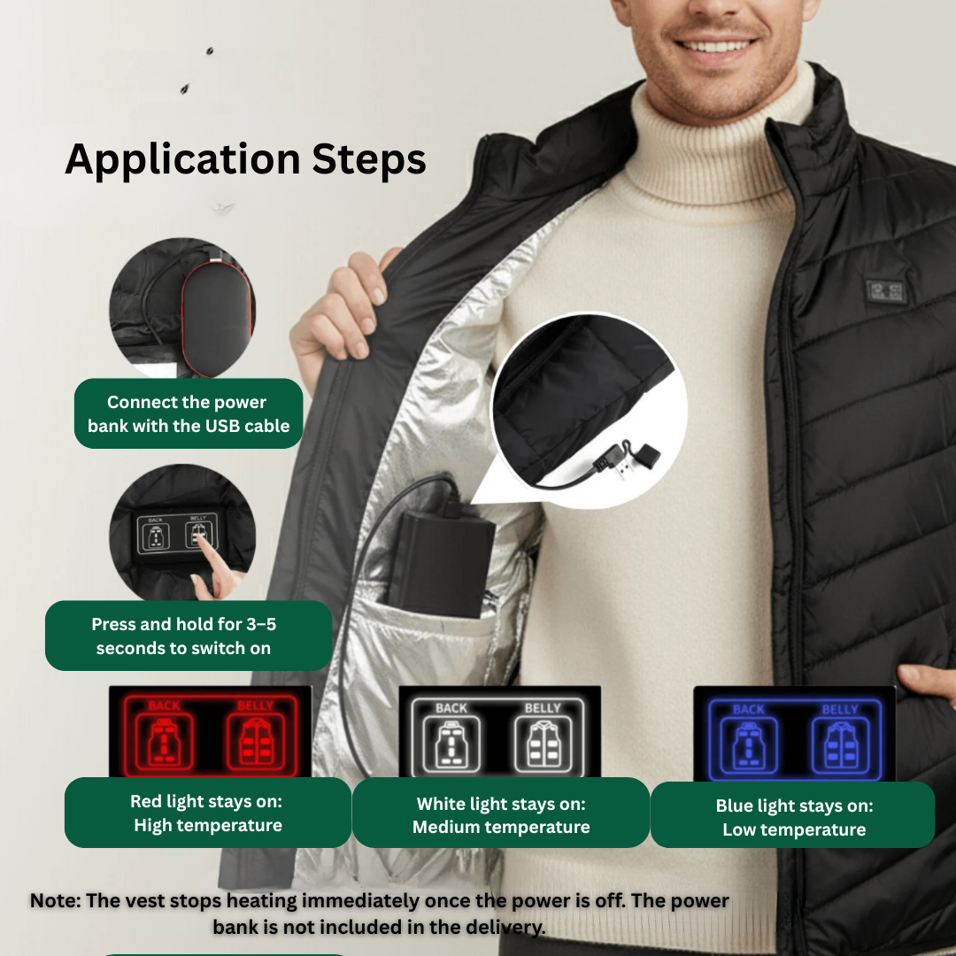 - Advanced Heating Zones – Nine strategically placed panels deliver targeted warmth across the chest, back, and waist.